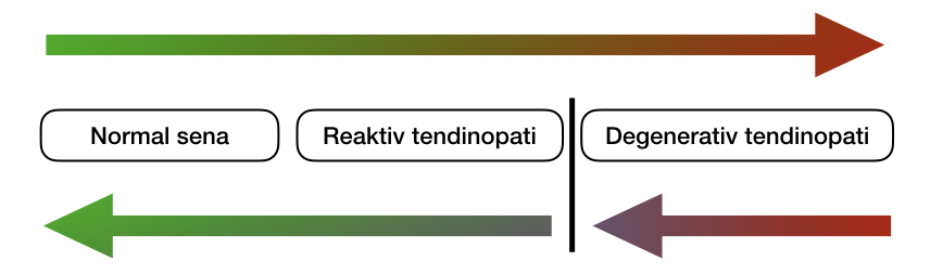 En muskelsenas struktur och ” microskopiska” utseende kan delas in i olika stadier. En sena som belastas regelbundet med möjlighet till återhämtning blir starkare och tål succecivt mera belastning. Om däremot senan utsätts för överbelastning kommer cellerna i senan att föröka sig och bilda ett protein som förändrar utseendet inuti senan. Senan är då i det andra stadiet – reaktiv. Om denna överbelastning fortsätter kommer antal celler i senan att fortsätta öka och tydligare förändring av senans struktur uppstår. Över tid kan också små blodkärl växa in i senan. Förändringar i detta stadie kallas degenerativa. Dessa förändringar i en sena tar tid och sker inte över en natt.