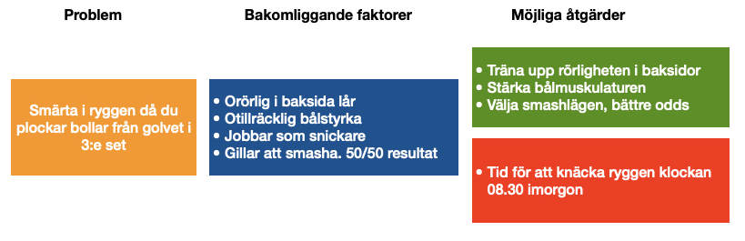 Det är just orsaken som är intressant att ta reda på och för det krävs ofta en omfattande analys av resurser och krav, träningsnivå och andra omständigheter. Utan de bakomligande faktorerna är det svårt att hitta en lösning som långsiktigt är hållbar. Om ni träffar någon som direkt lovar att bota er när ni pekar på stället ni har ont, vänd om och gå därifrån!